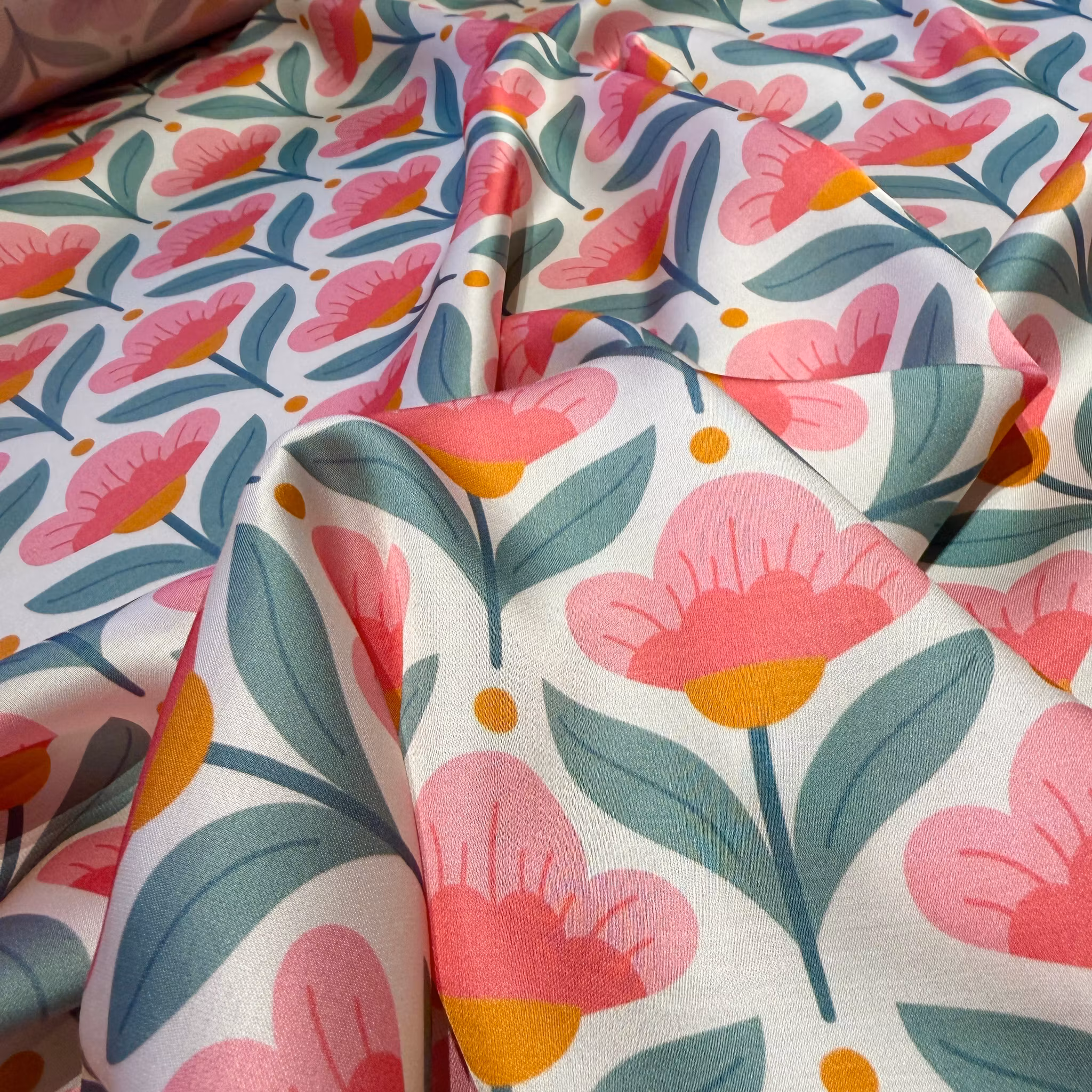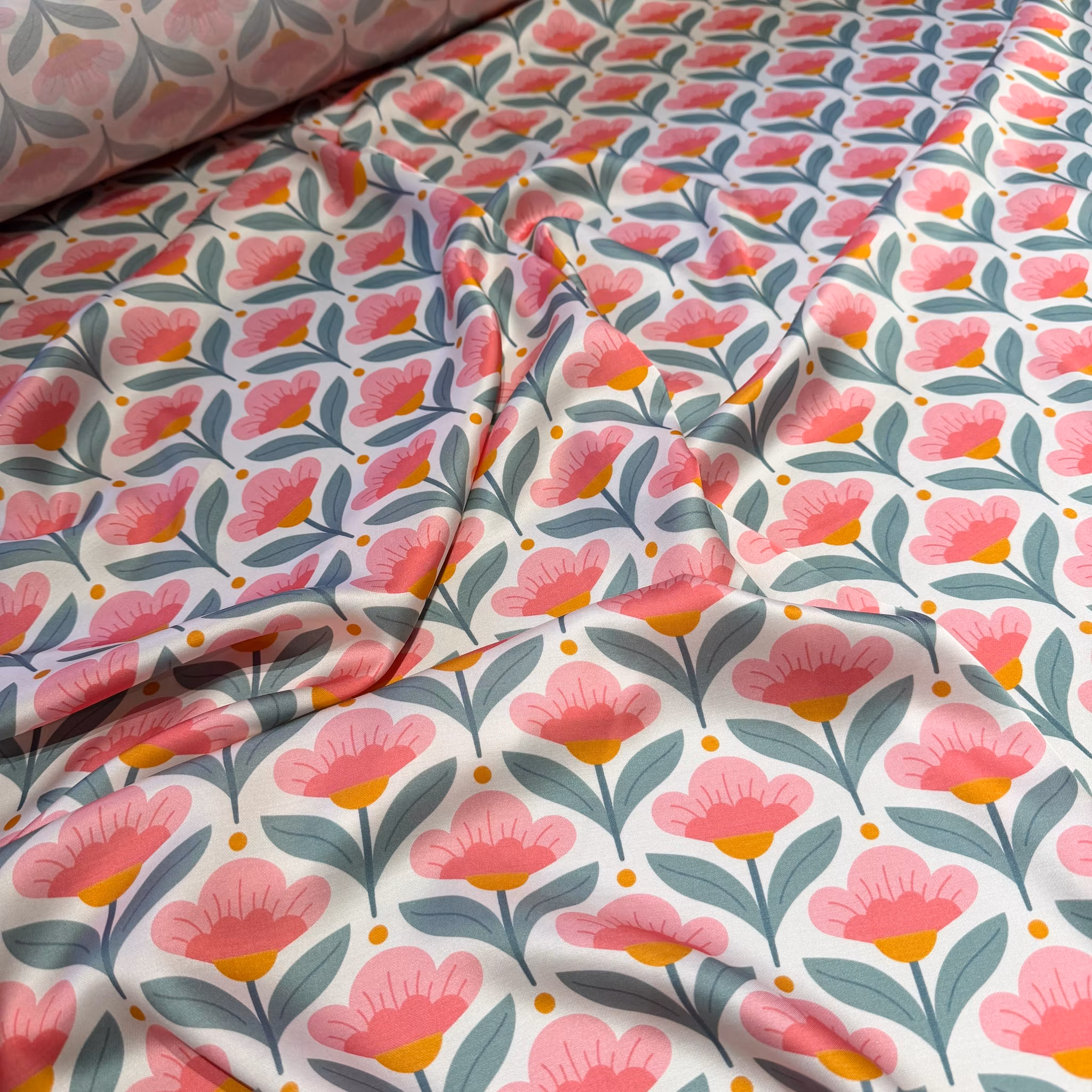 Färg: vit botten, blommor i två rosa nyanser och senapsgult och grågrönt.