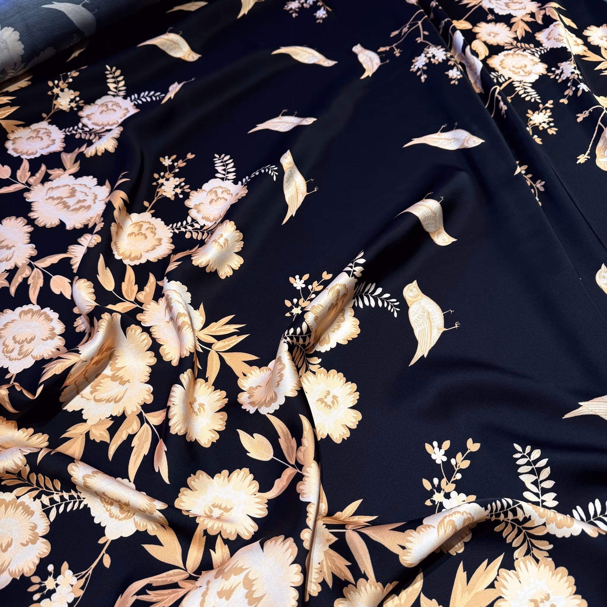 Färg: svart botten, blombårder längs båda sidorna, fåglar i mitten. Mönster i guldbeige.