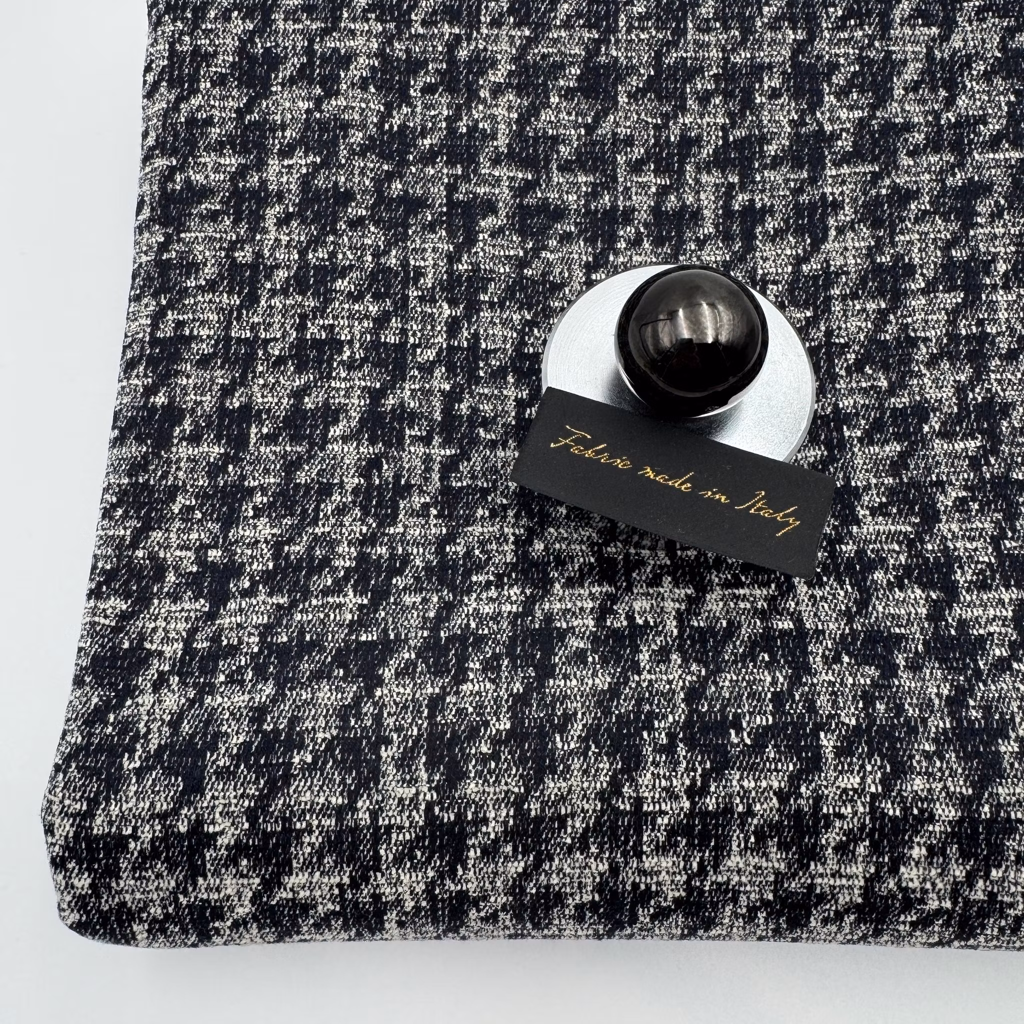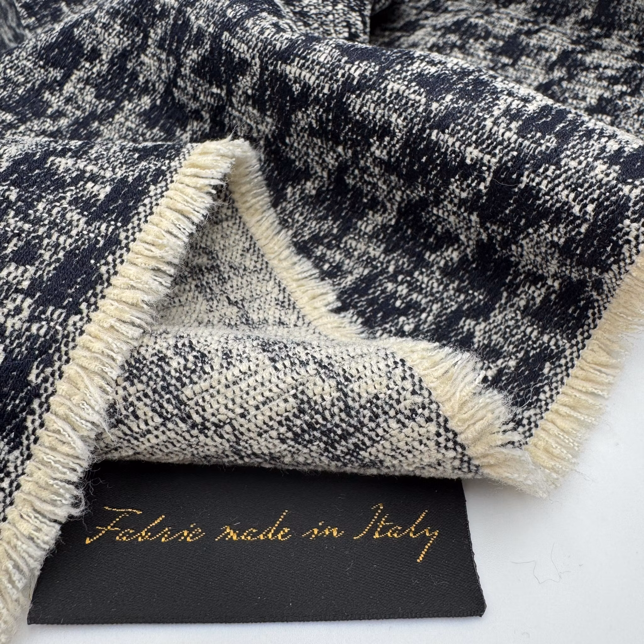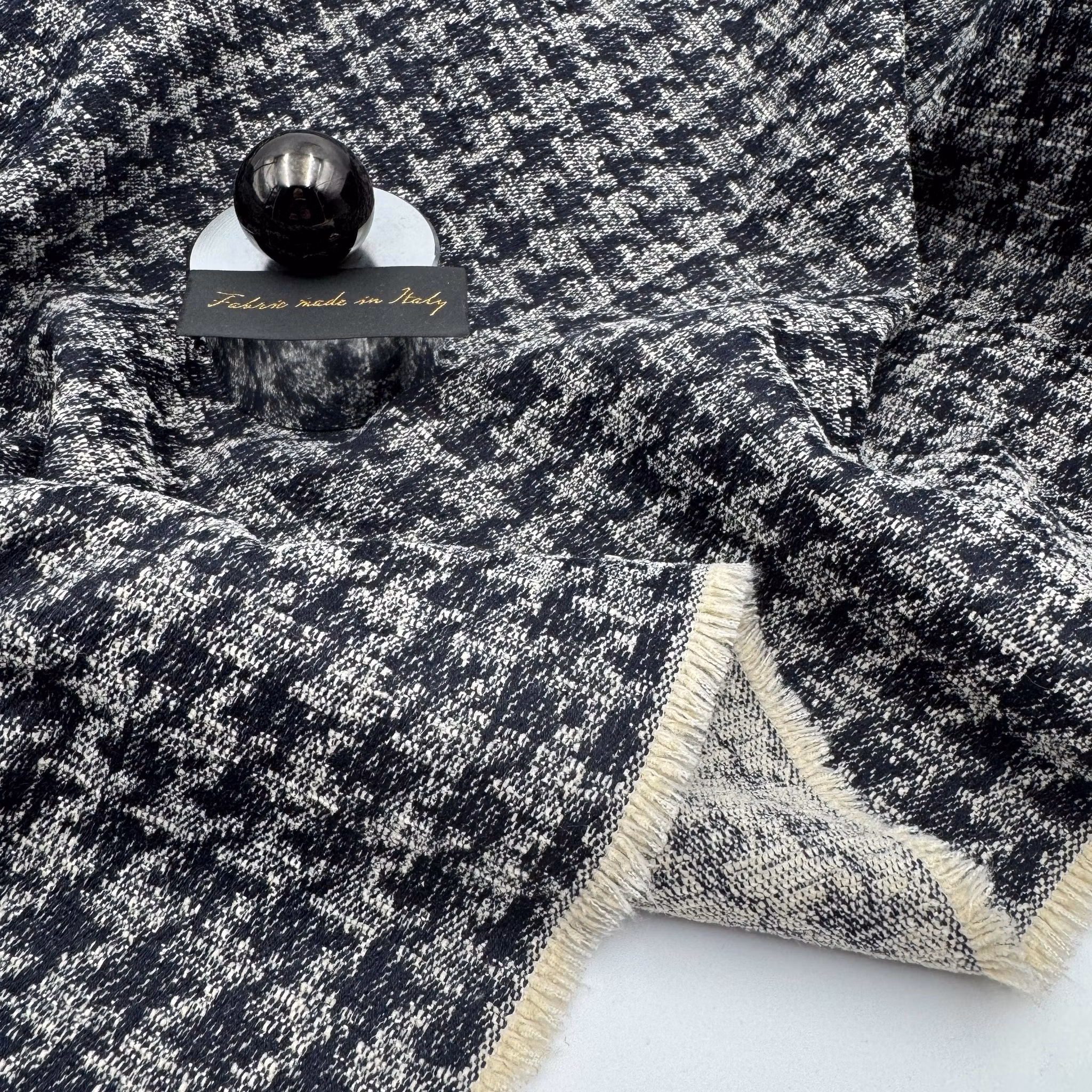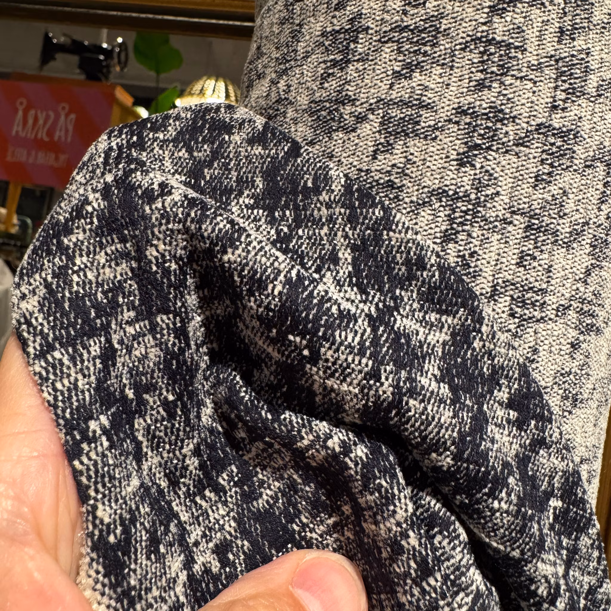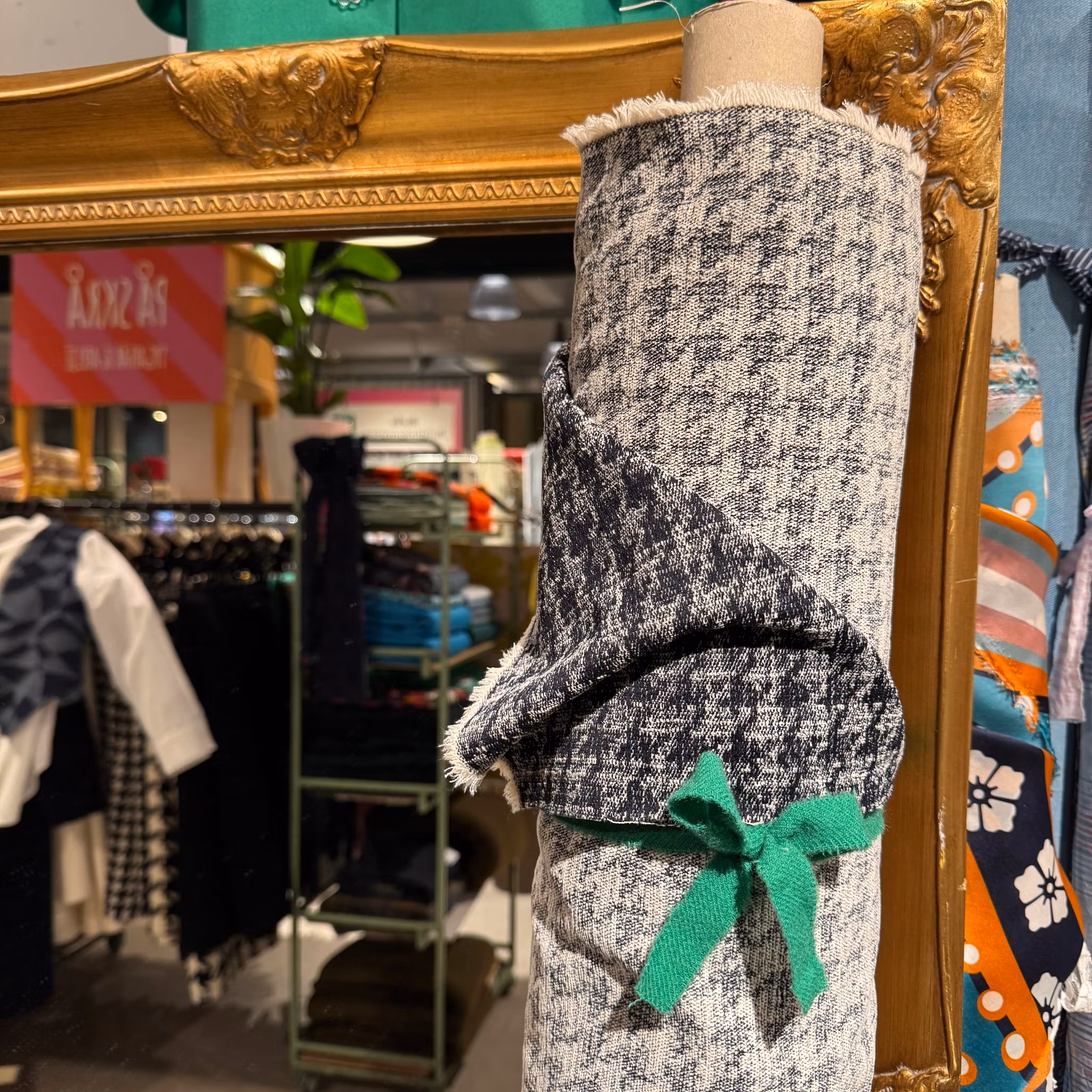Material: Huvudsakligen bomull men lite för mycket andra fibrer för att kvala in i vårt ordinarie sortiment, därför säljer vi det till halva priset. Som korthårig sammet/chenille. Ganska kraftigt men väldigt mjukt. Melerat/diffust hundtandsmönstrat.