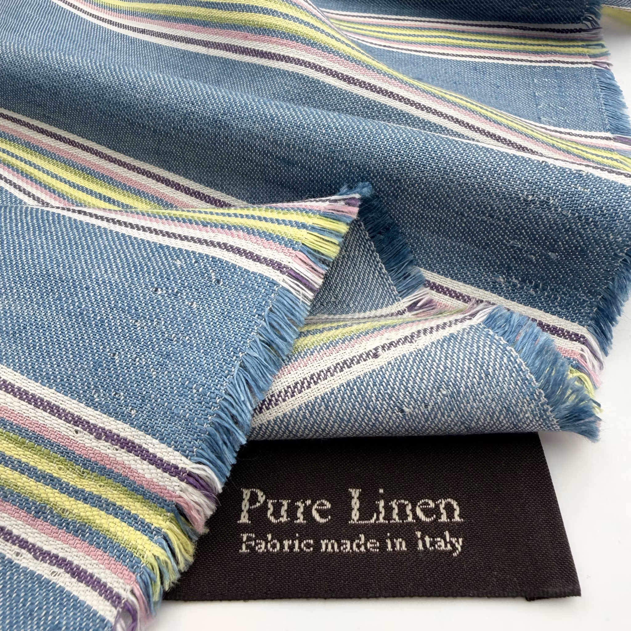 Färg: jeansblått med vävda ränder i pastellfärger på bredden.