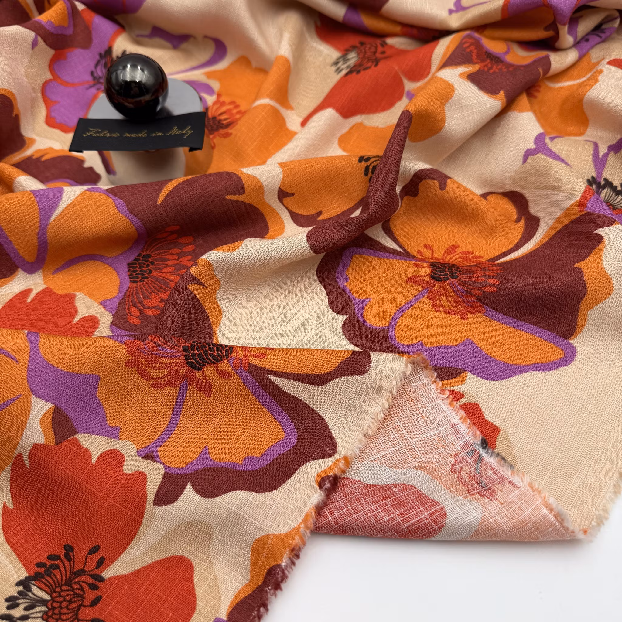Färg: varmbeige botten, blommor i beige, orange, lila, röd och vinröd.