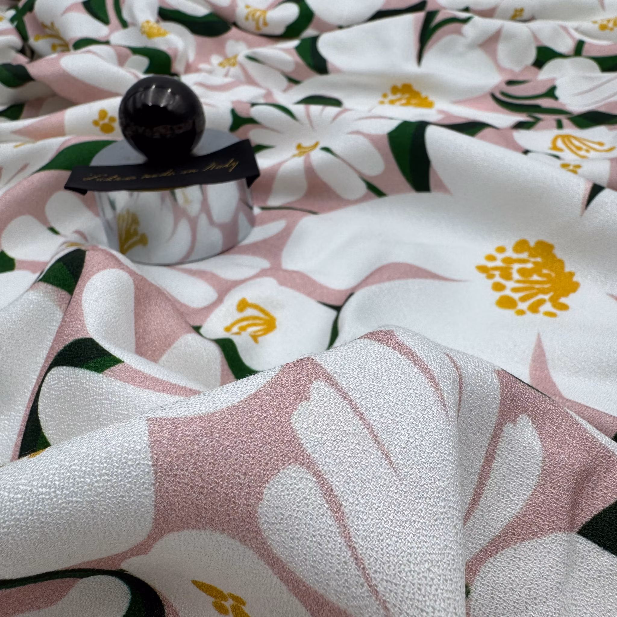 Färg: mild rosa botten, vita blommor och gula och gröna detaljer.