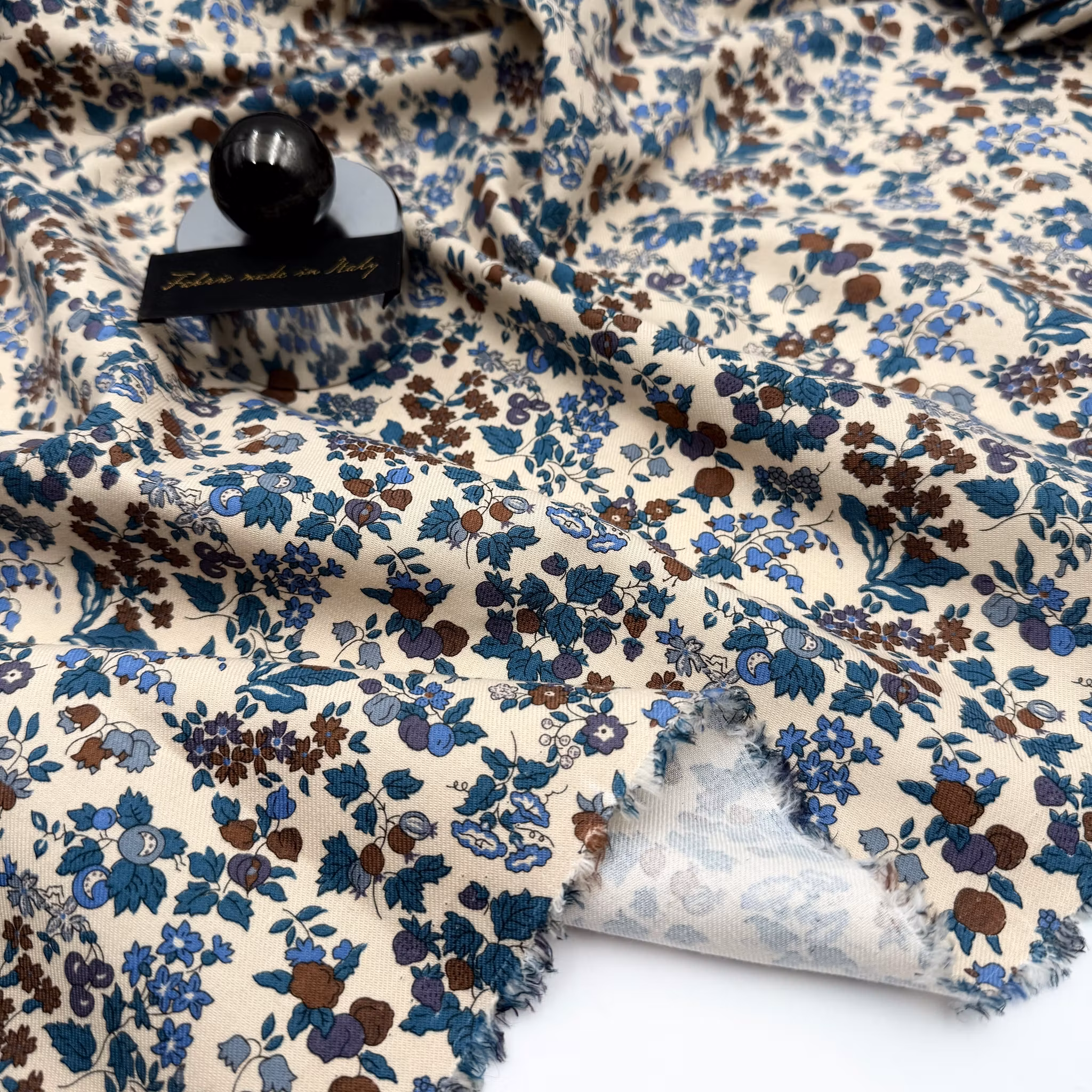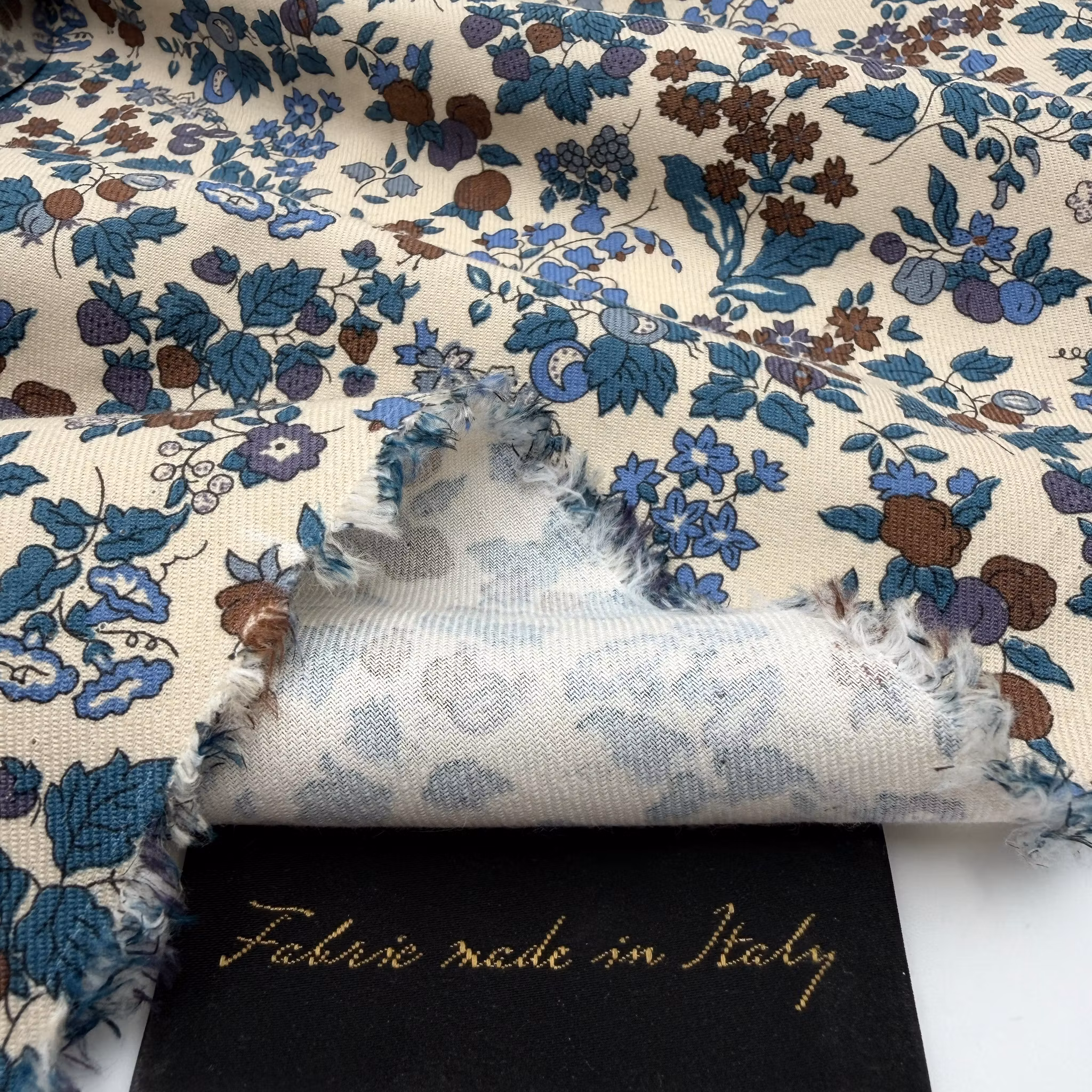 Färg: Gräddvit botten, blommor i blått och brunt.