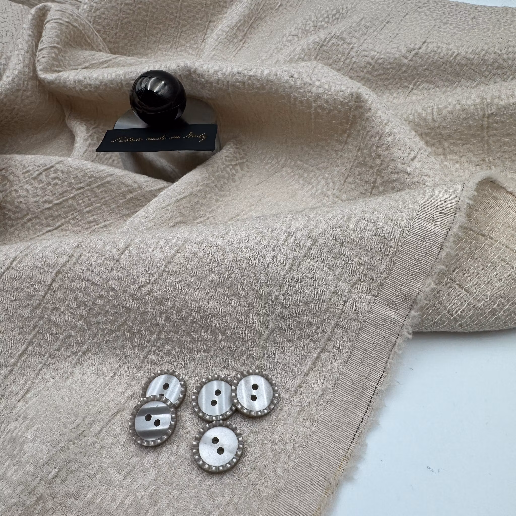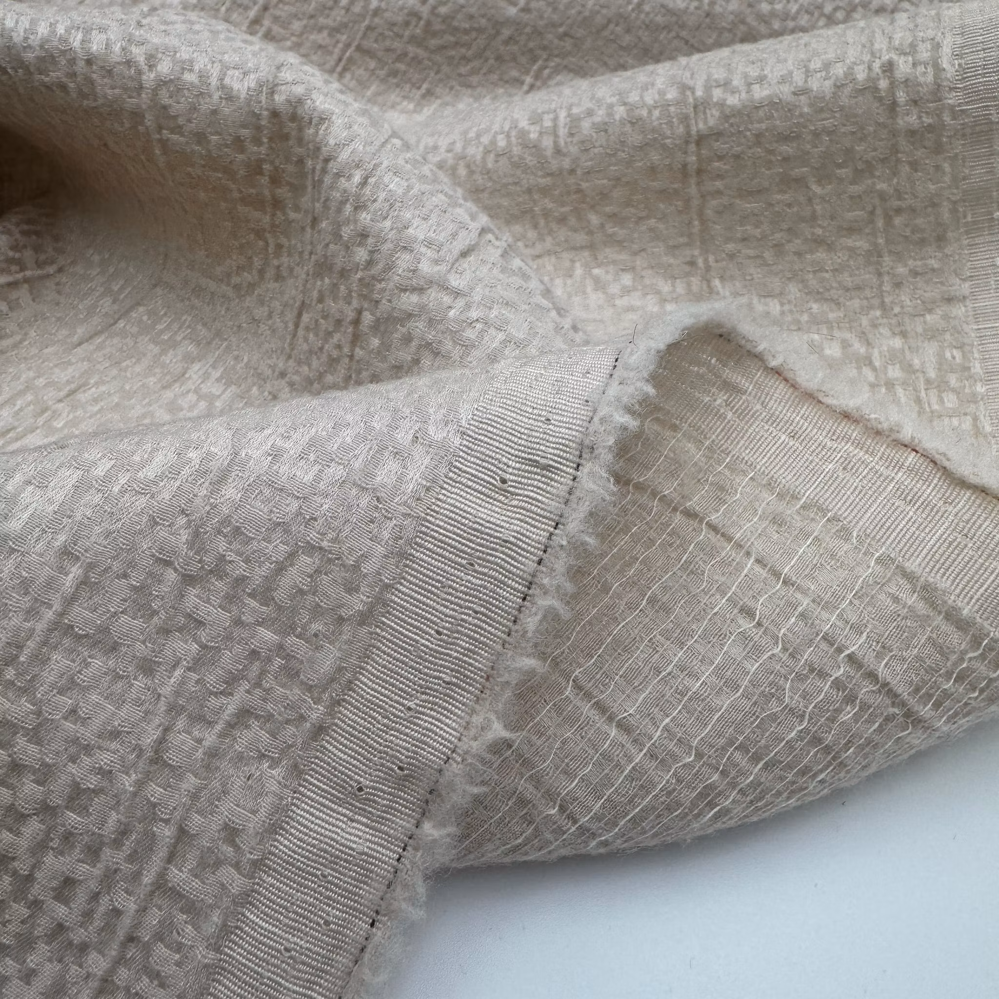 Material: Ull/siden/viskos (55/40/5), struktur i ytan, nästan som bäckebölja, lite kringlad. Ser lyxig ut.