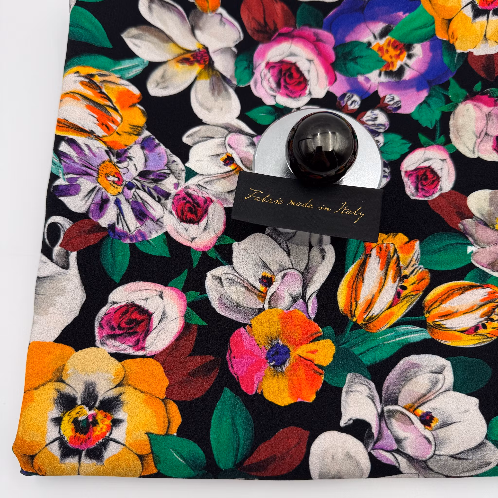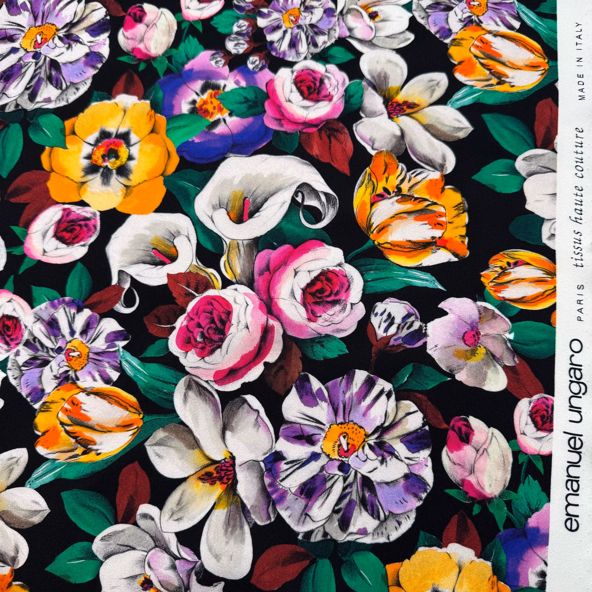 Färg: svart botten, blommor i gult, rosa, lila och vitt.