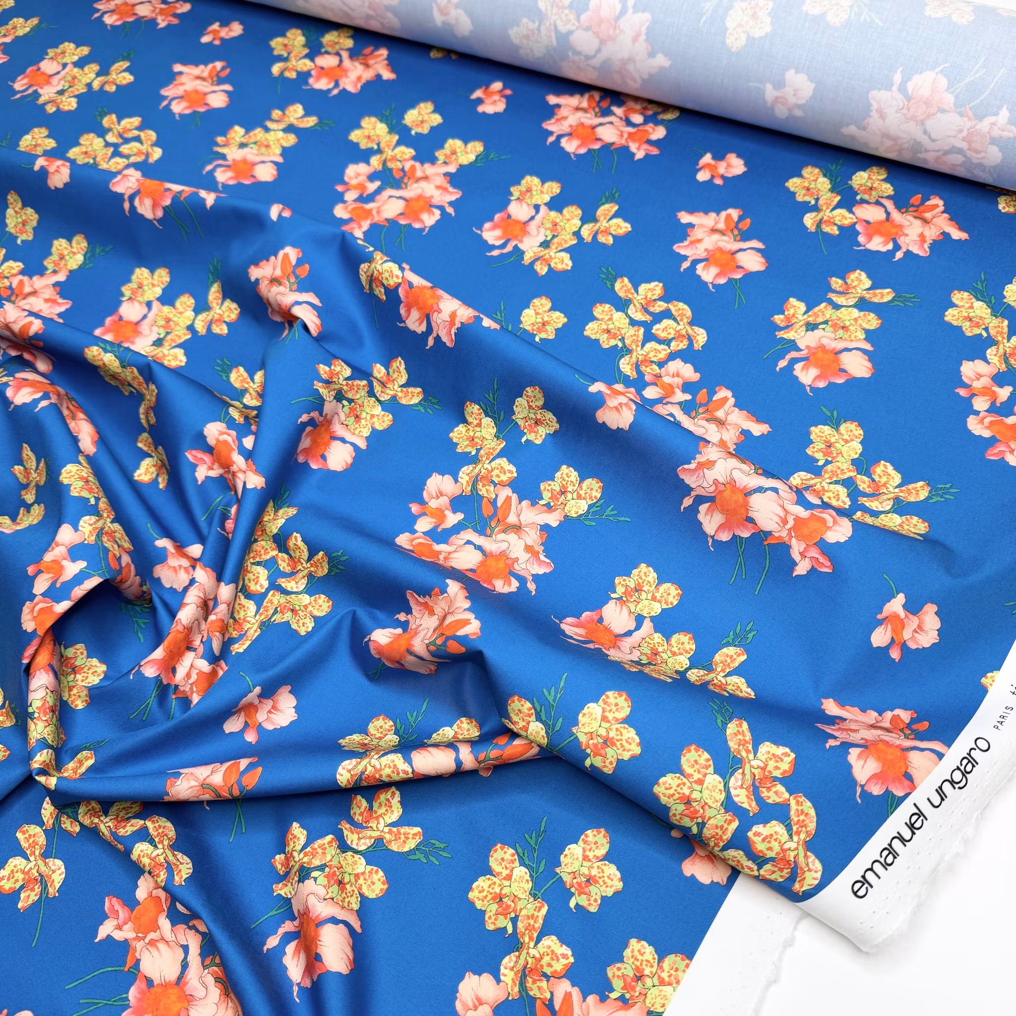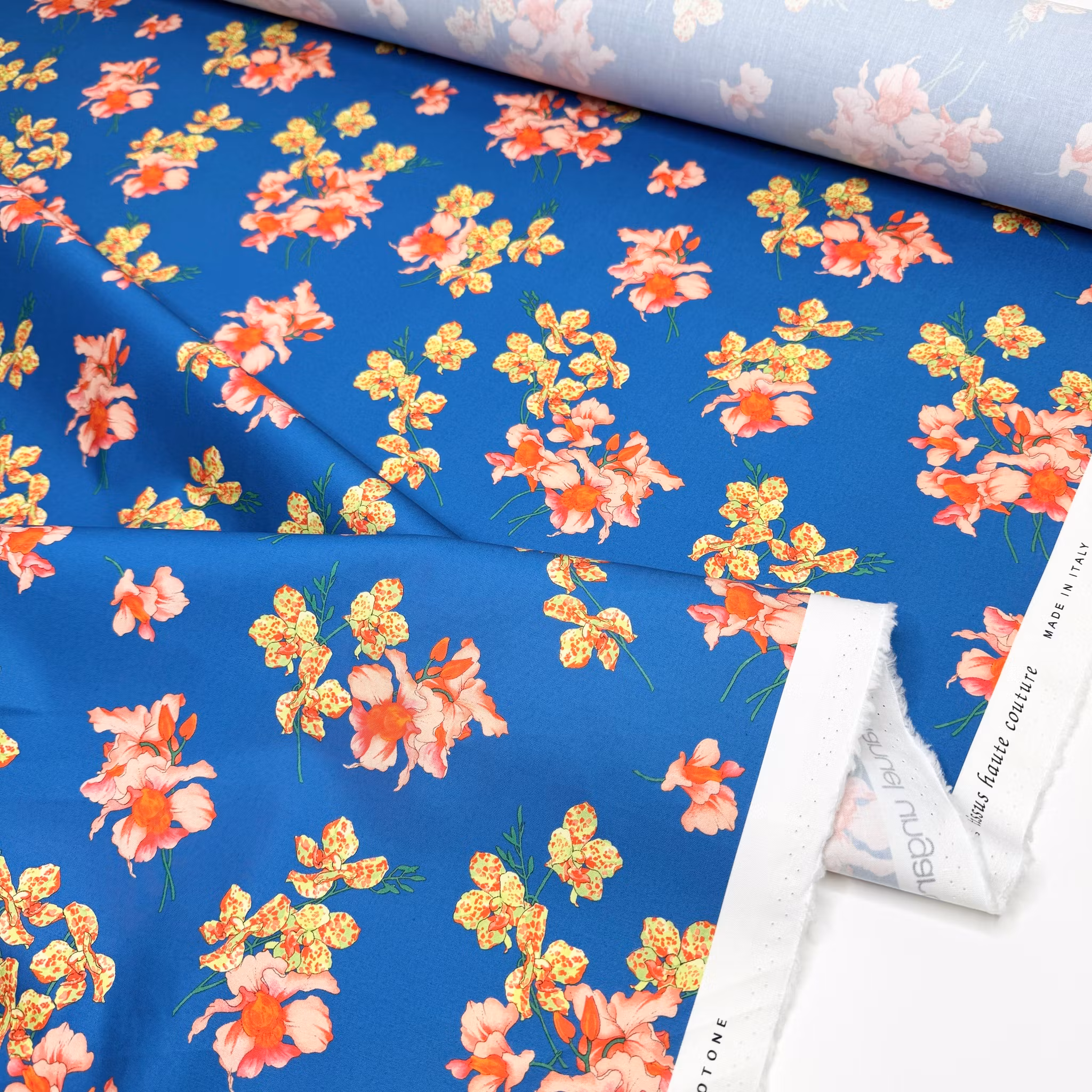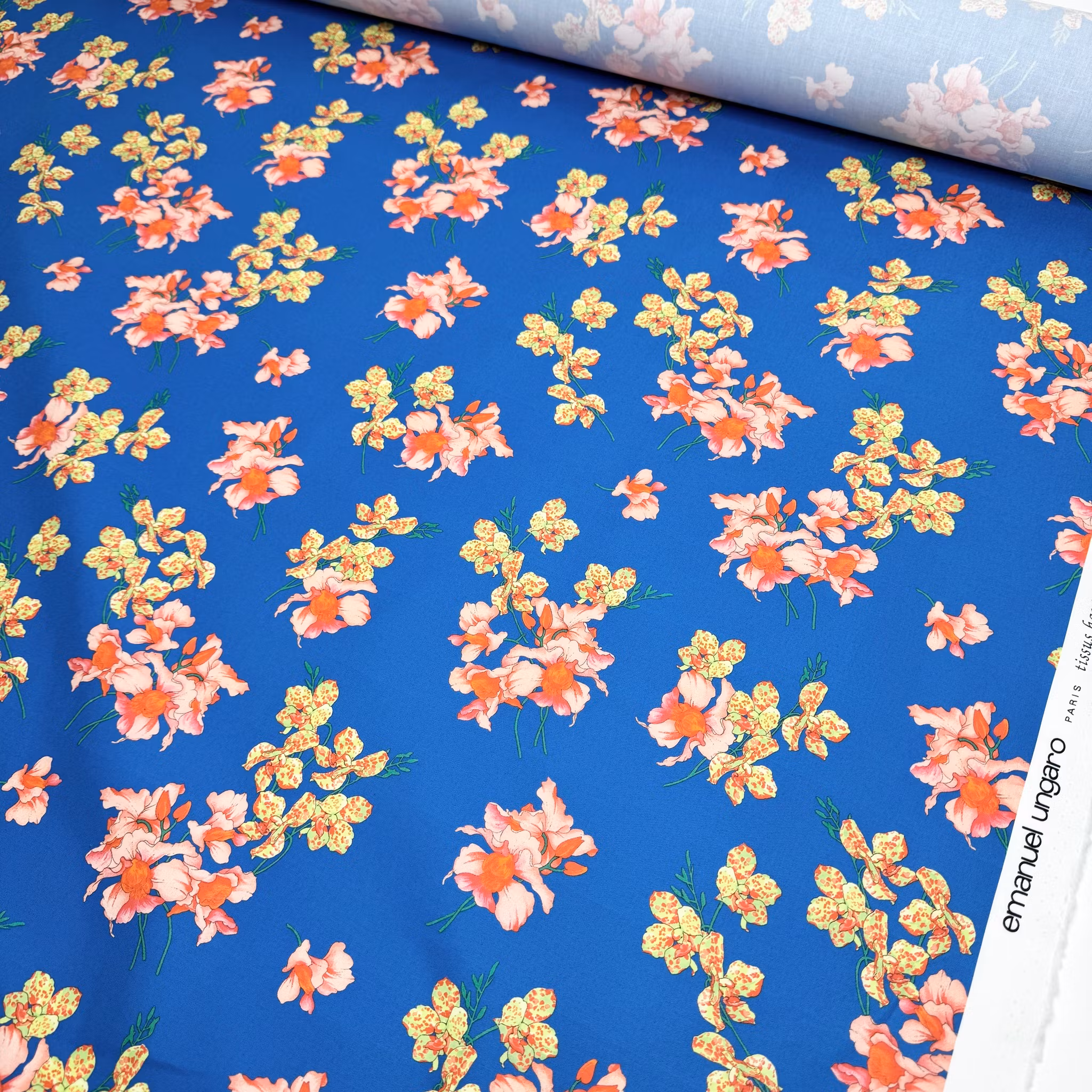 Färg: himmelsblå botten med orkidéer i ljusrött och gulgrönt