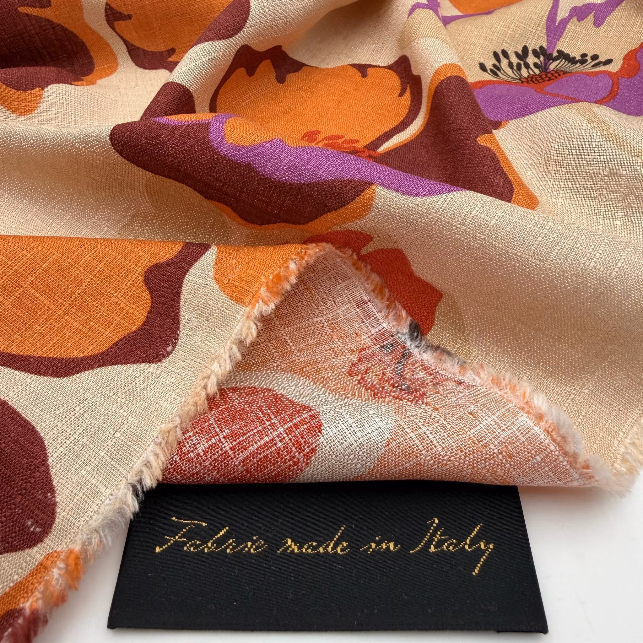 Färg: varmbeige botten, blommor i beige, orange, lila, röd och vinröd.