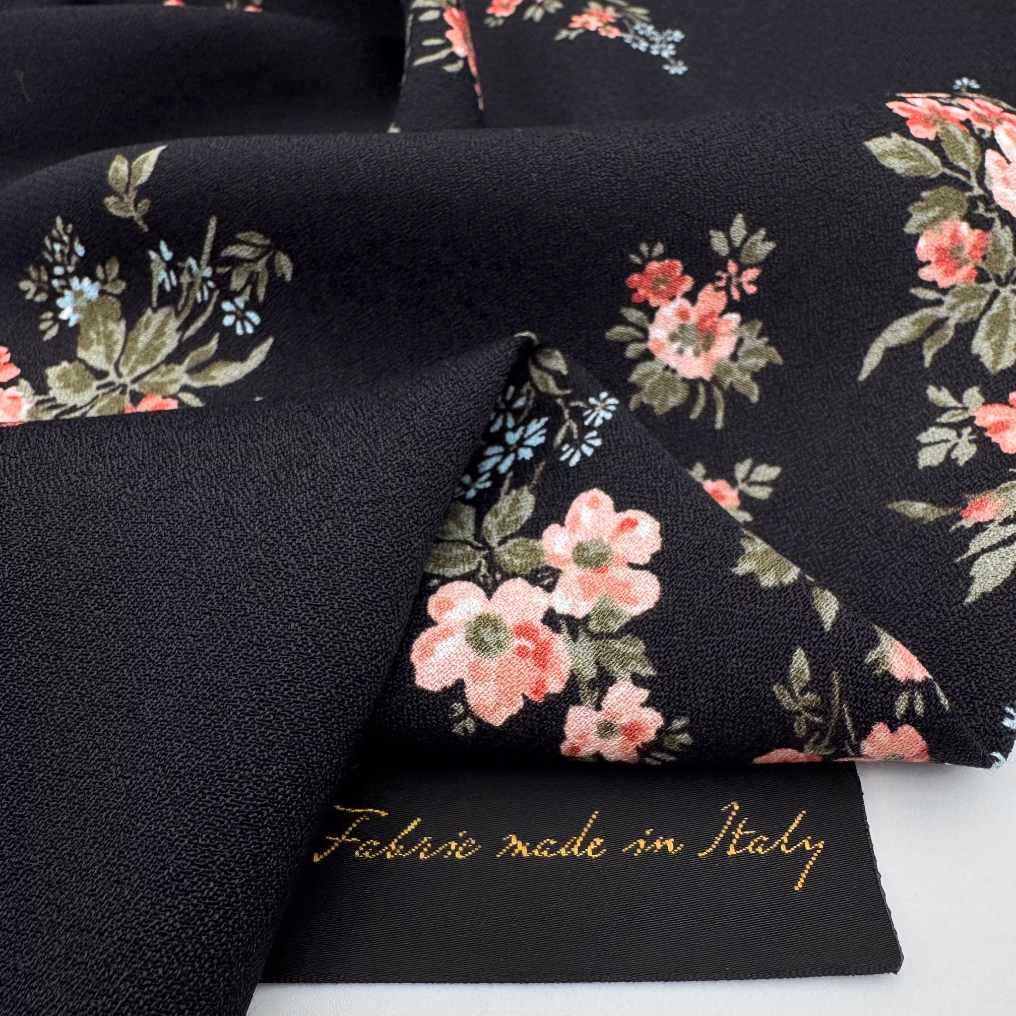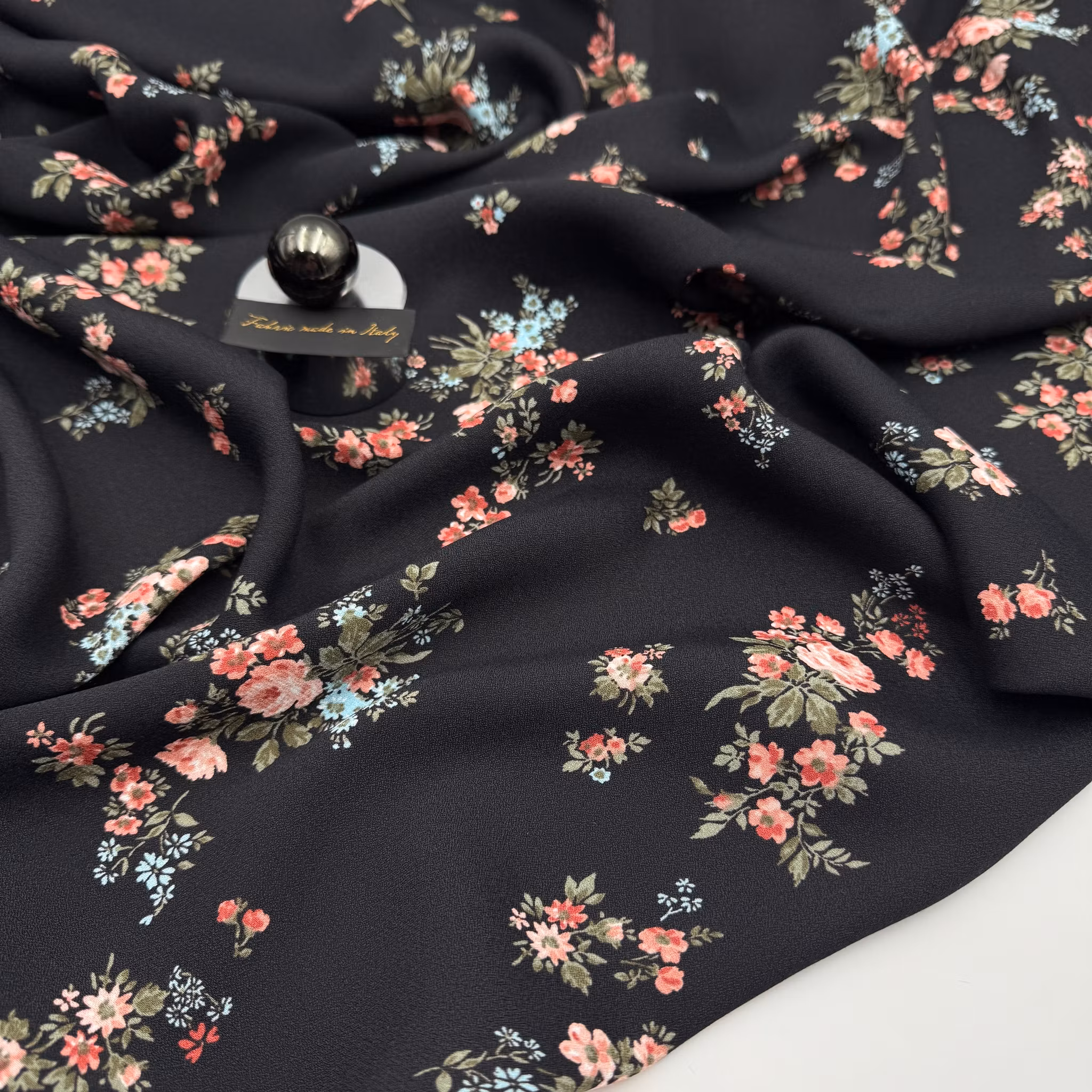 Färg: svart botten, blommor i laxrosa, ljusblått och khakigrönt.