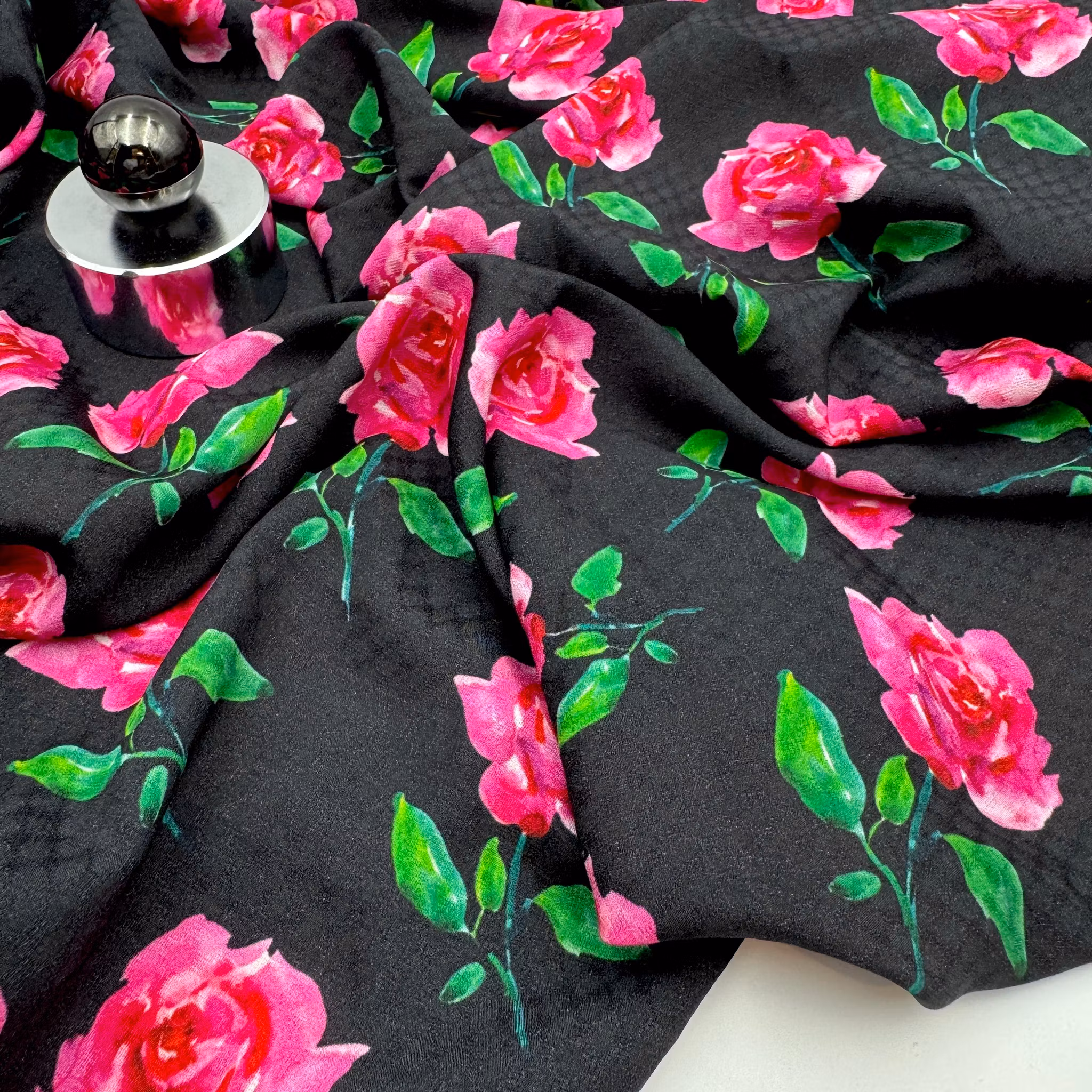 Färg: svart botten, cerisa rosor