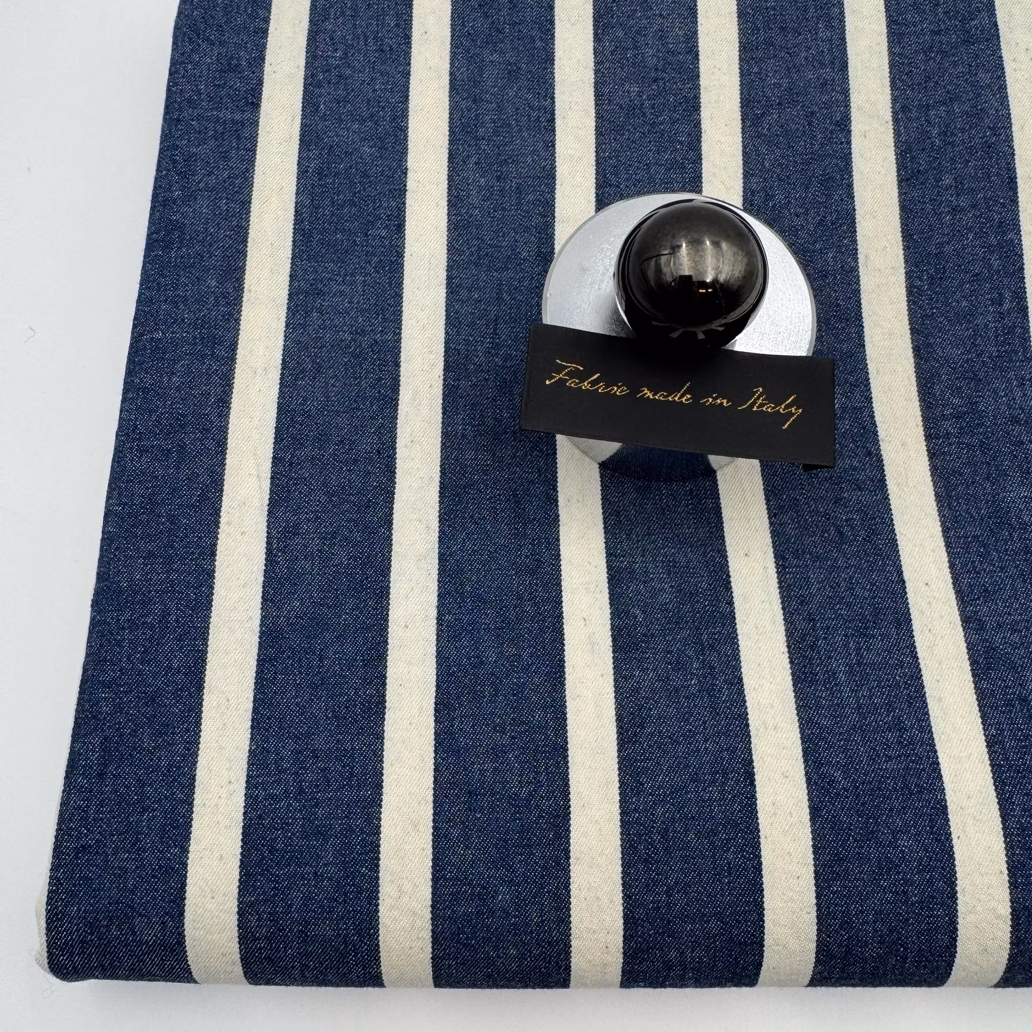 Färg: Mörk jeansblå med gräddvita ränder på längden.