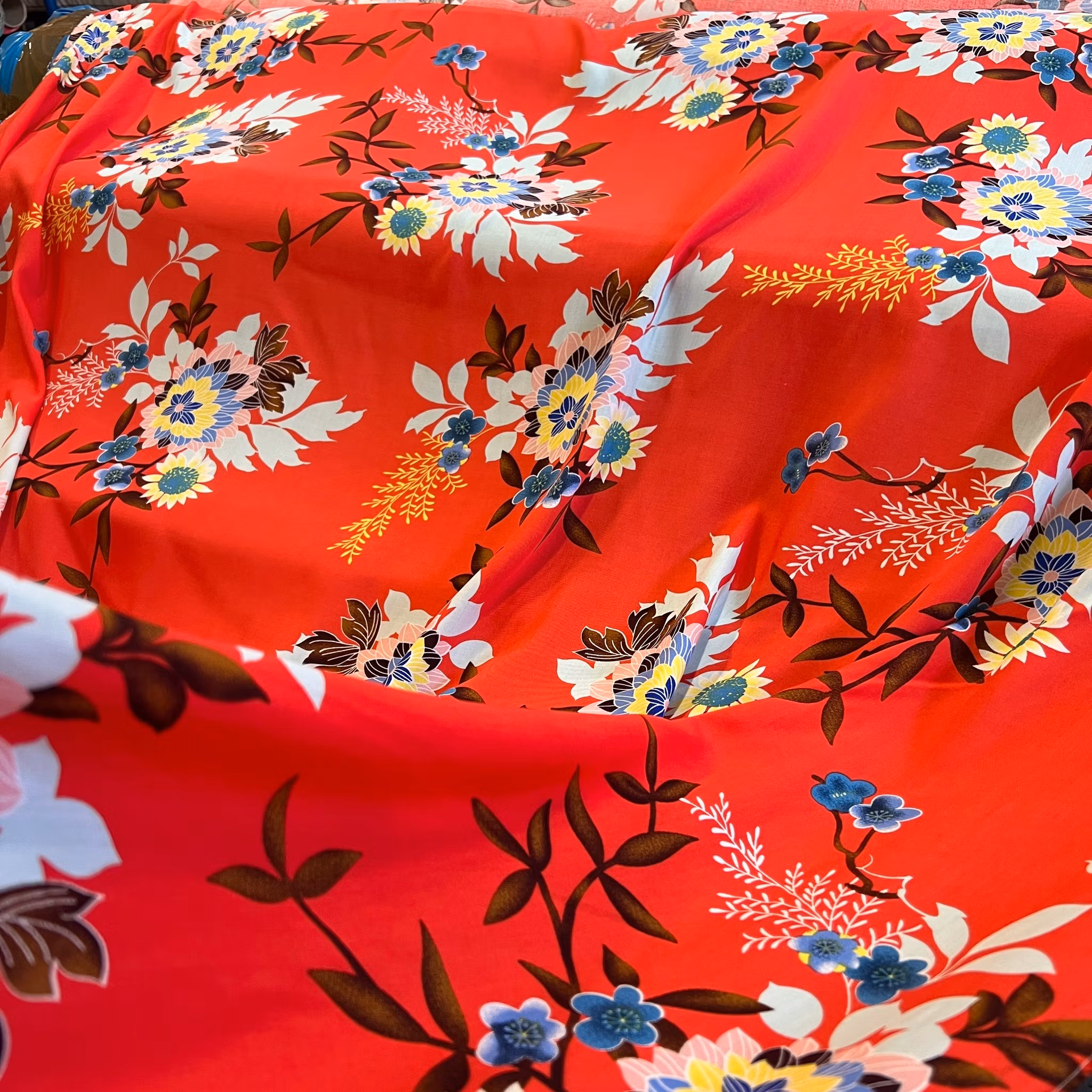 Färg: ljusröd botten, tryck i klara färger