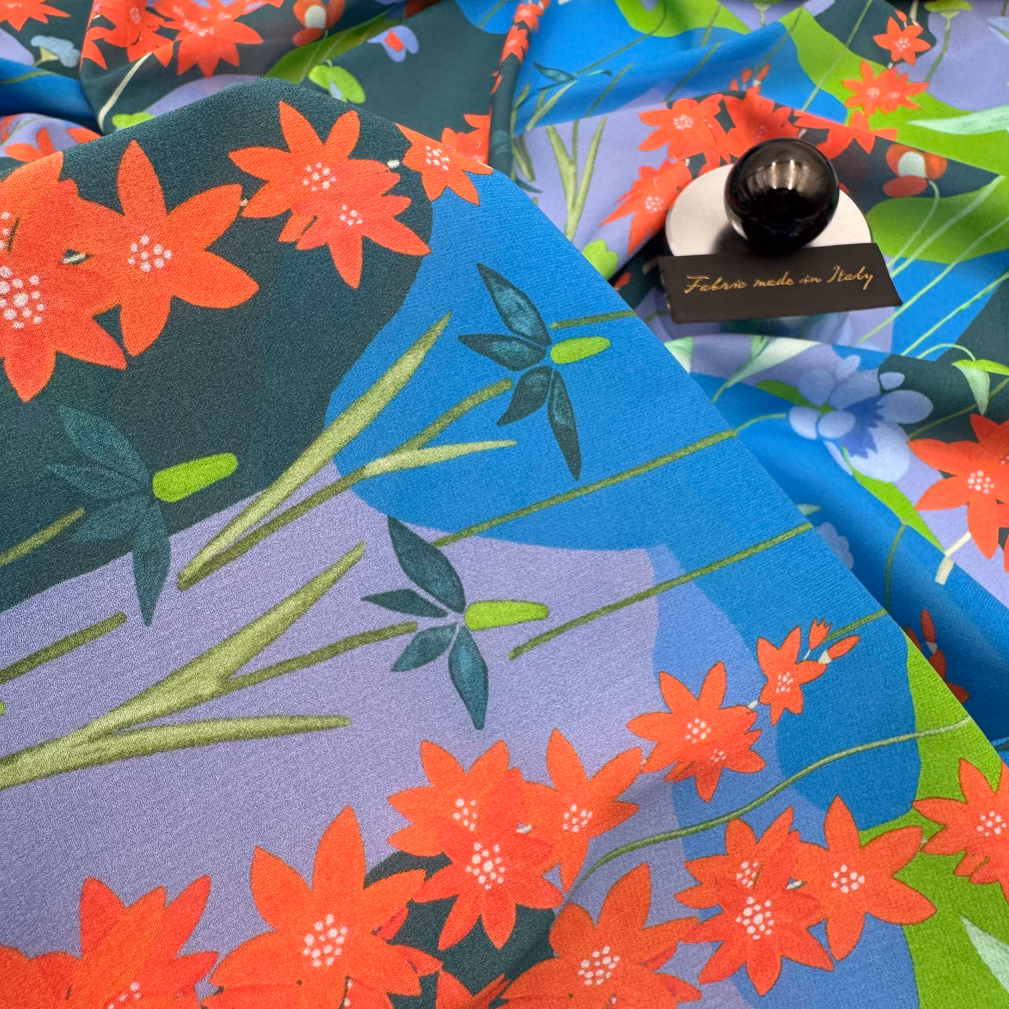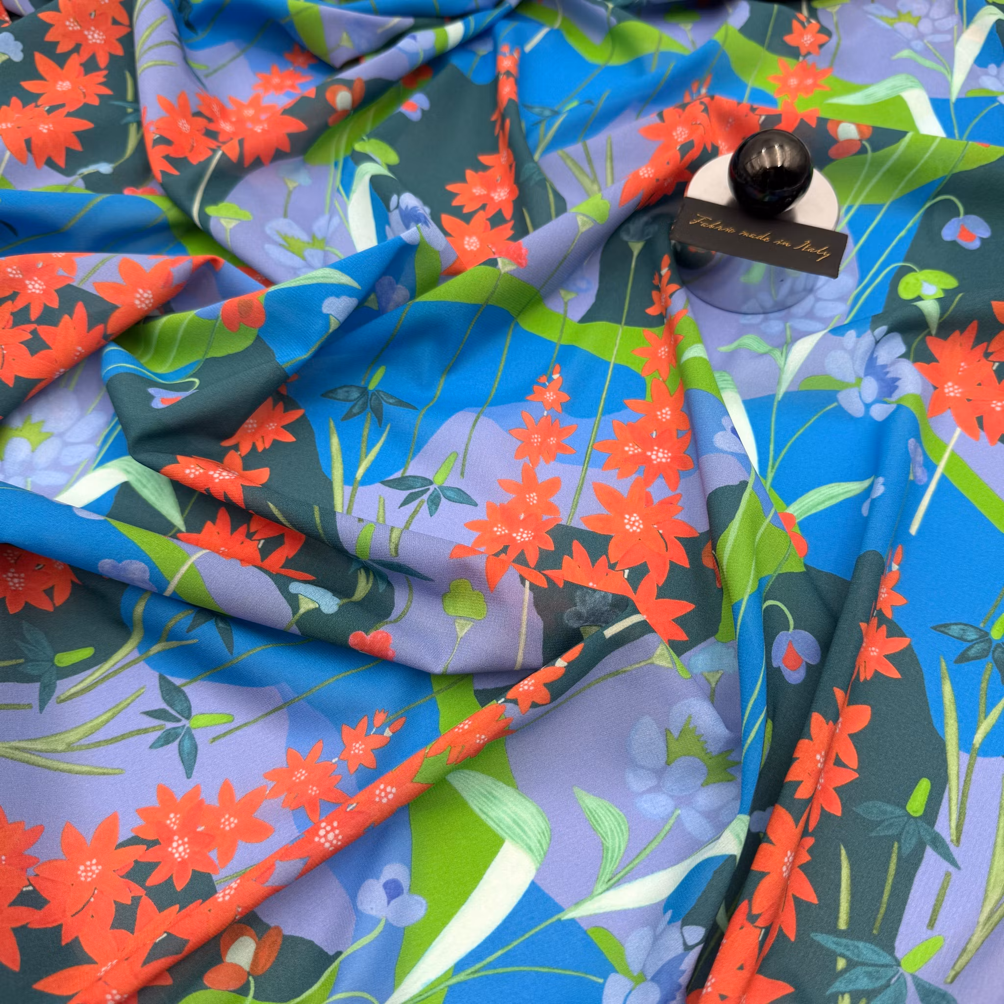 Färg: olika nyanser av blått och grönt i botten, ljusröda blommor.