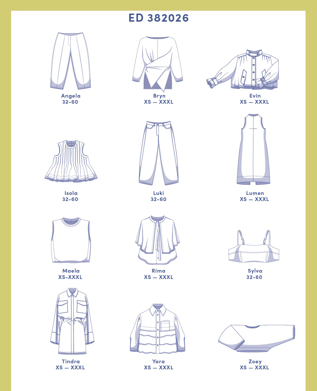 Upptäck mönster som känns festliga men samtidigt praktiska. Angela och Luki ger klassiska byxor en modern twist, medan Bryn och Isola utforskar linjer, veck och asymmetri. Lumen och Tindra står för eleganta statement-plagg som känns både sofistikerade och avslappnade, och Yara tillför en lekfull touch med sina volanger. Samtidigt visar Evin, Rima och Zoey att genomtänkta detaljer och smarta skärningar räcker för att göra en outfit speciell, medan Maela och Sylva fokuserar på lager-på-lager och transparenta inslag.