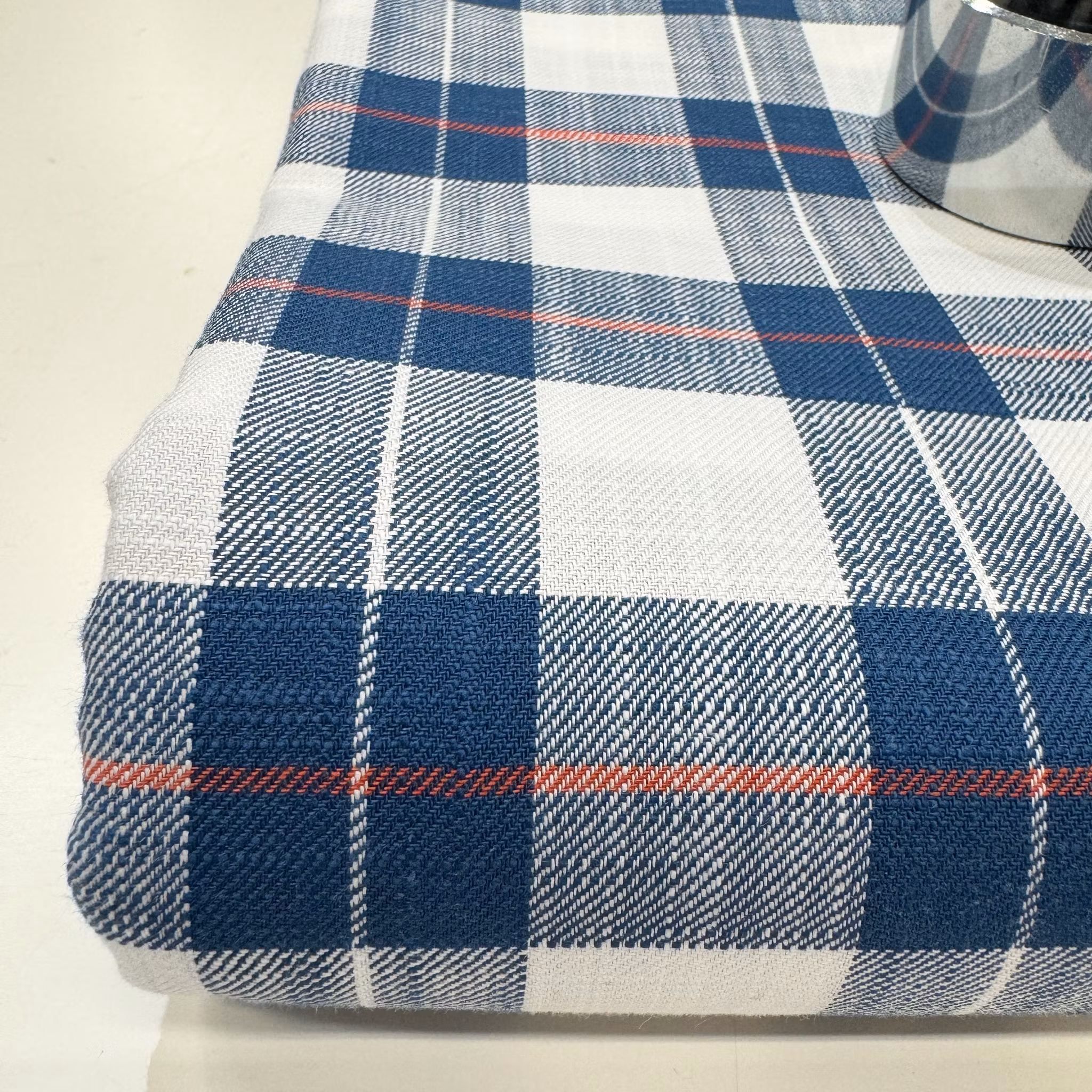 Färg: vit botten och rutor i blått som går åt petrol och en smal rostfärgad rand