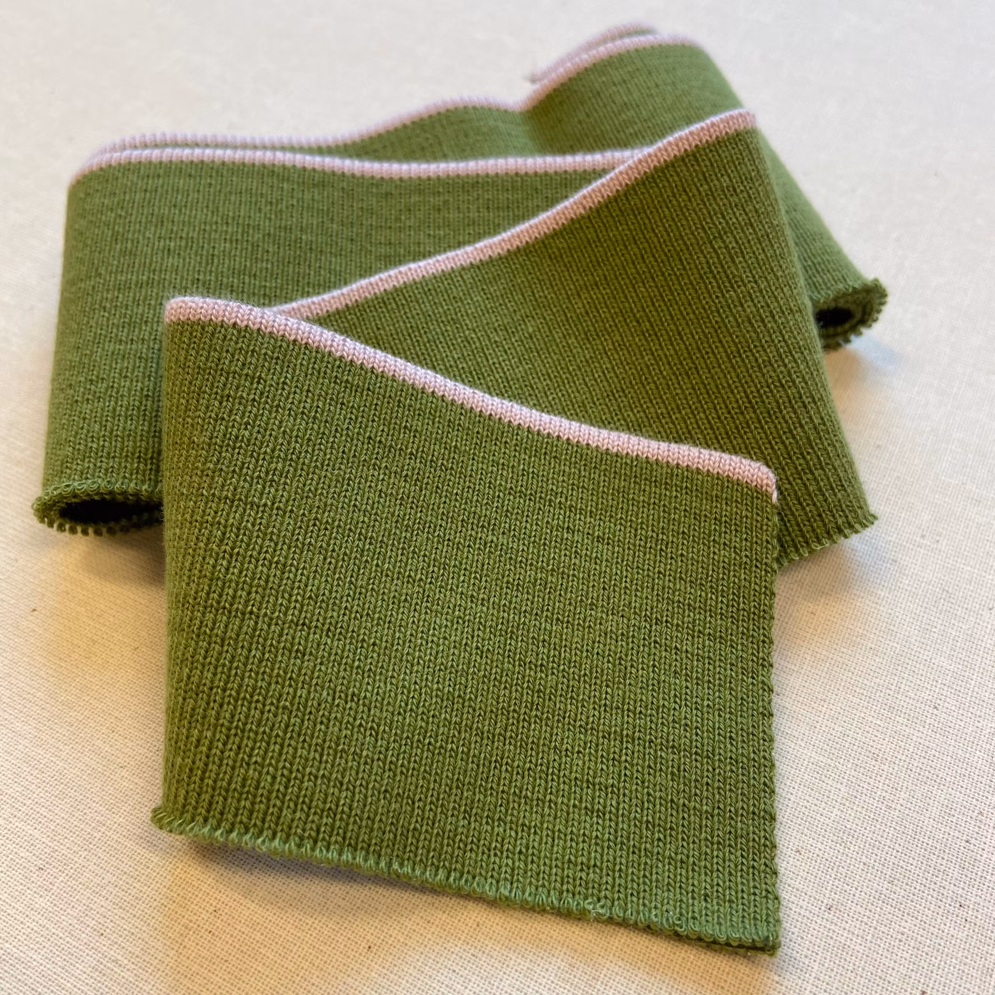 Muddremsa från Merchant & Mills i ljusgrönt med en ljusrosa rand upptill. Längd ca 100 cm, bredd 6 cm. Räcker till antingen halskant och ärmslut eller nederkant. Vill man ha mudd överallt eller om man syr en stor storlek (L eller större) behöver man två remsor.