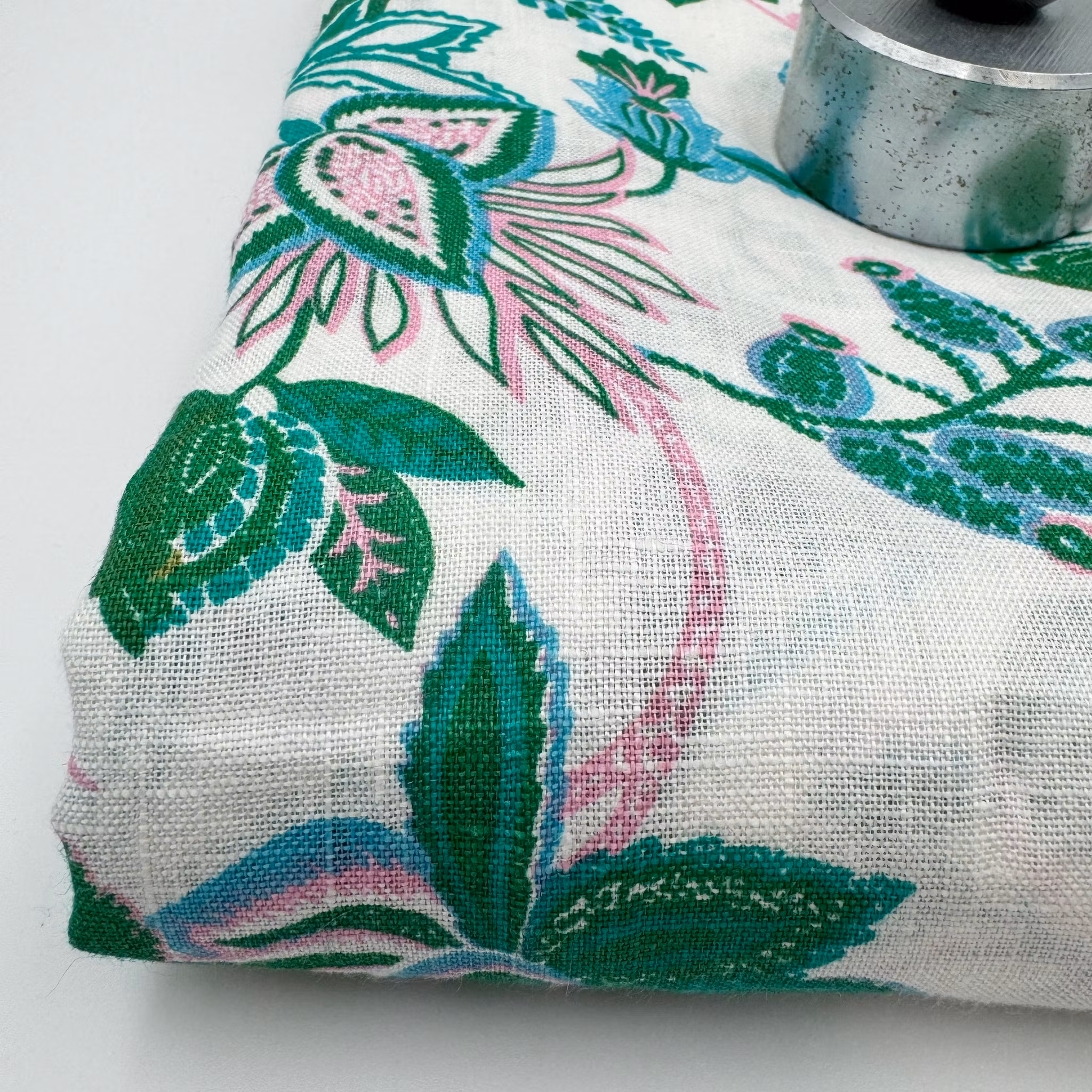 Färg: vit botten, tryckta blommor och blad i klargrönt och rosa och lite turkost.