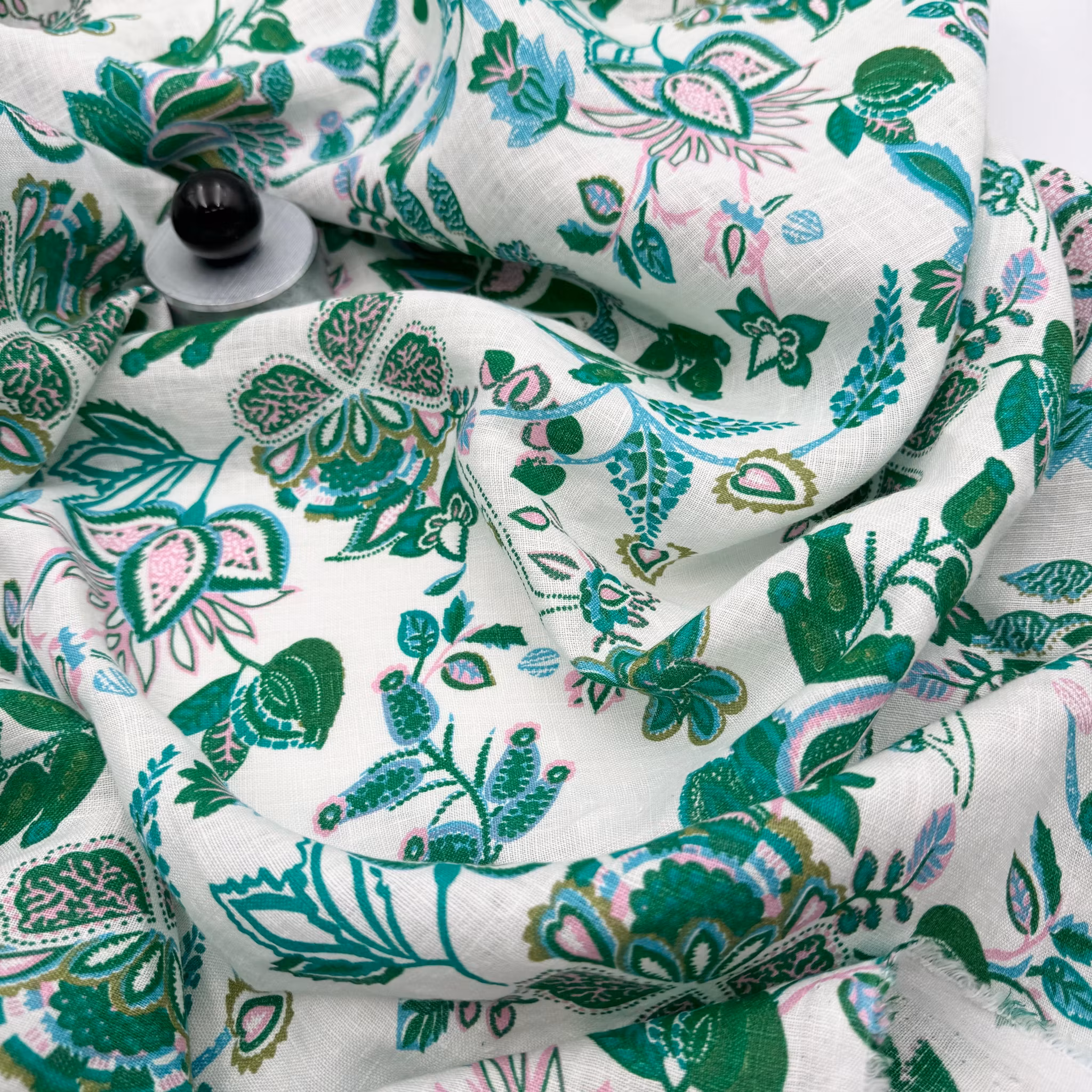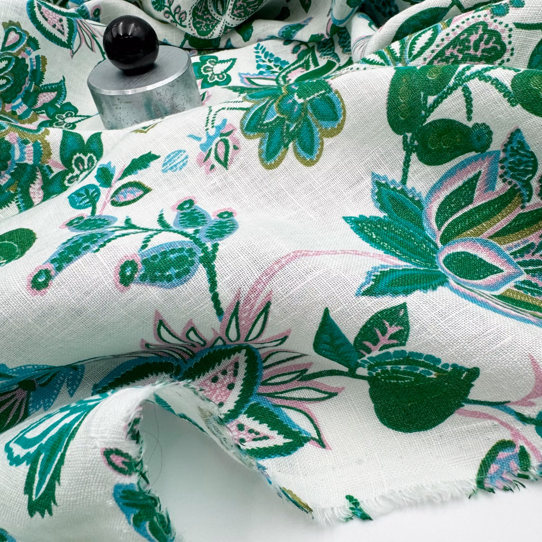 Material: 100% lin med tryckta blommor och blad