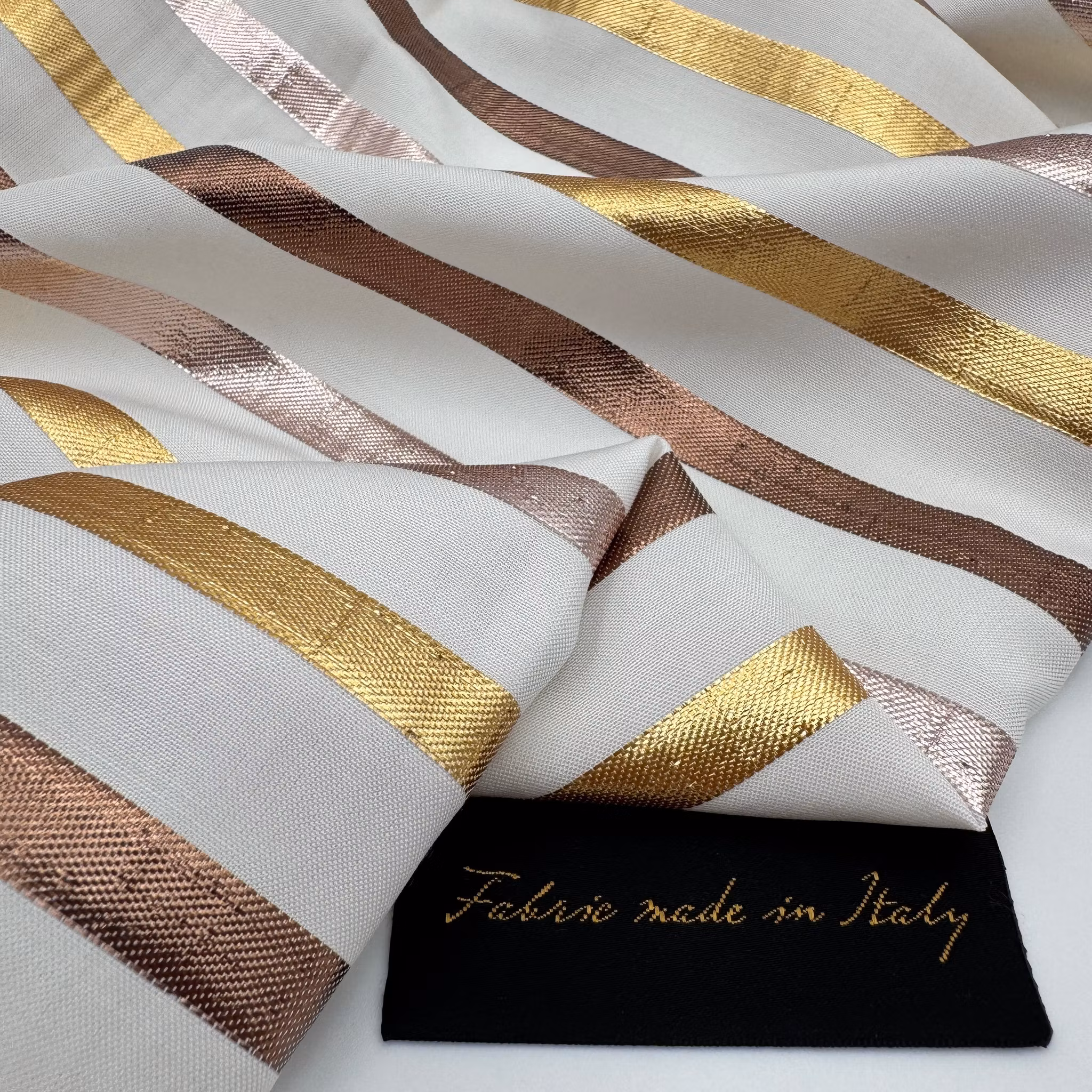 Färg: vit botten, vävda lurexränder i guld, kpppar och rosé på bredden.