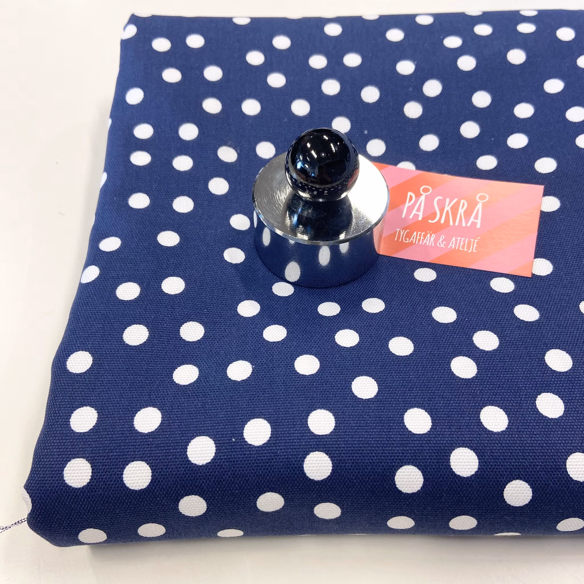 Färg: Mörkblå botten, vita, centimeterstora, oregelbundna prickar.