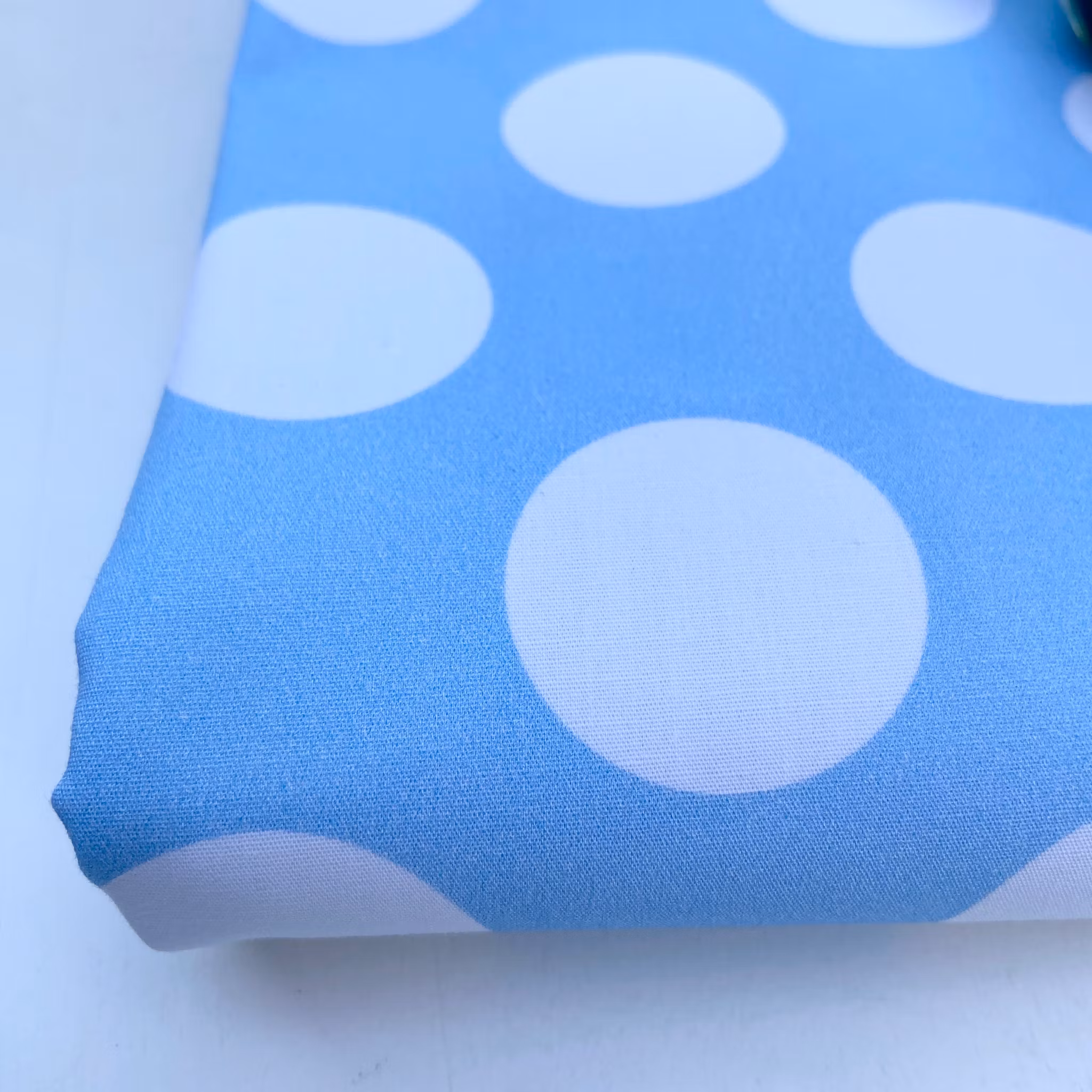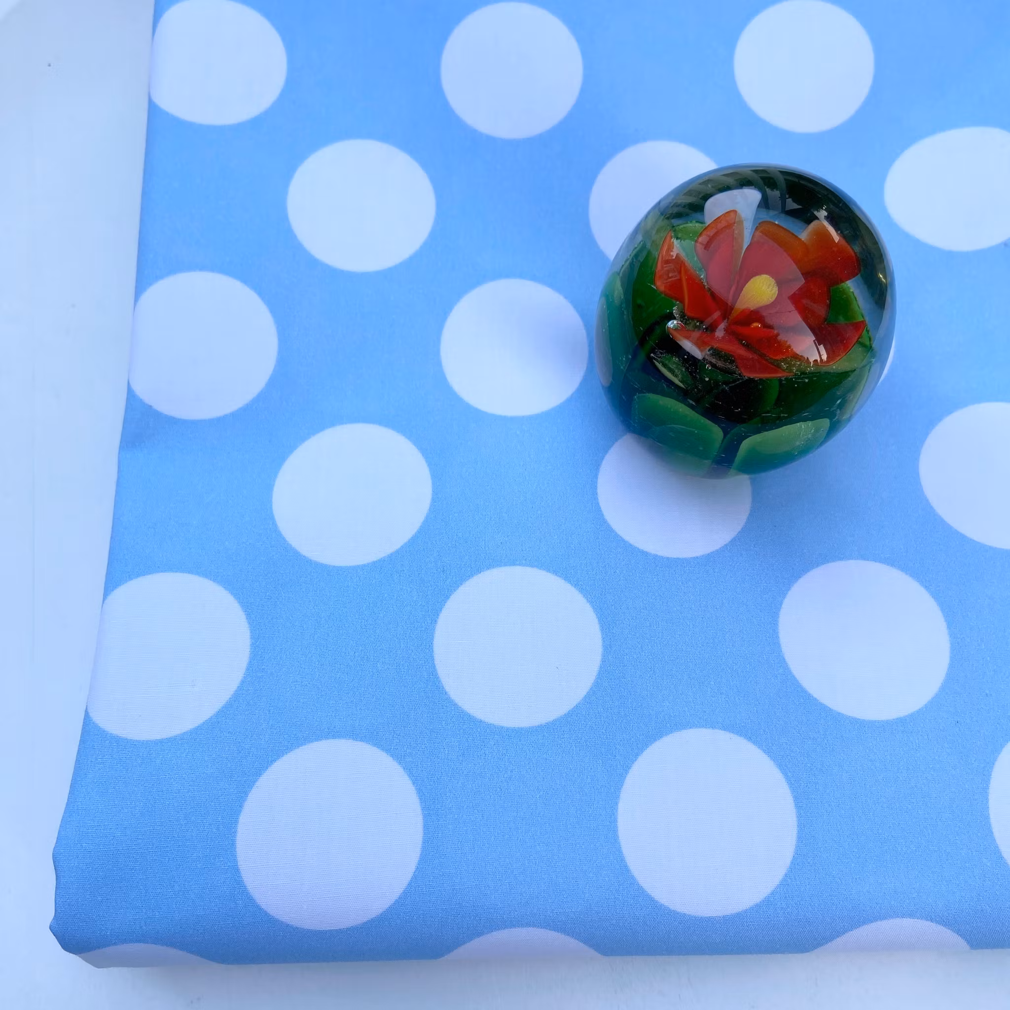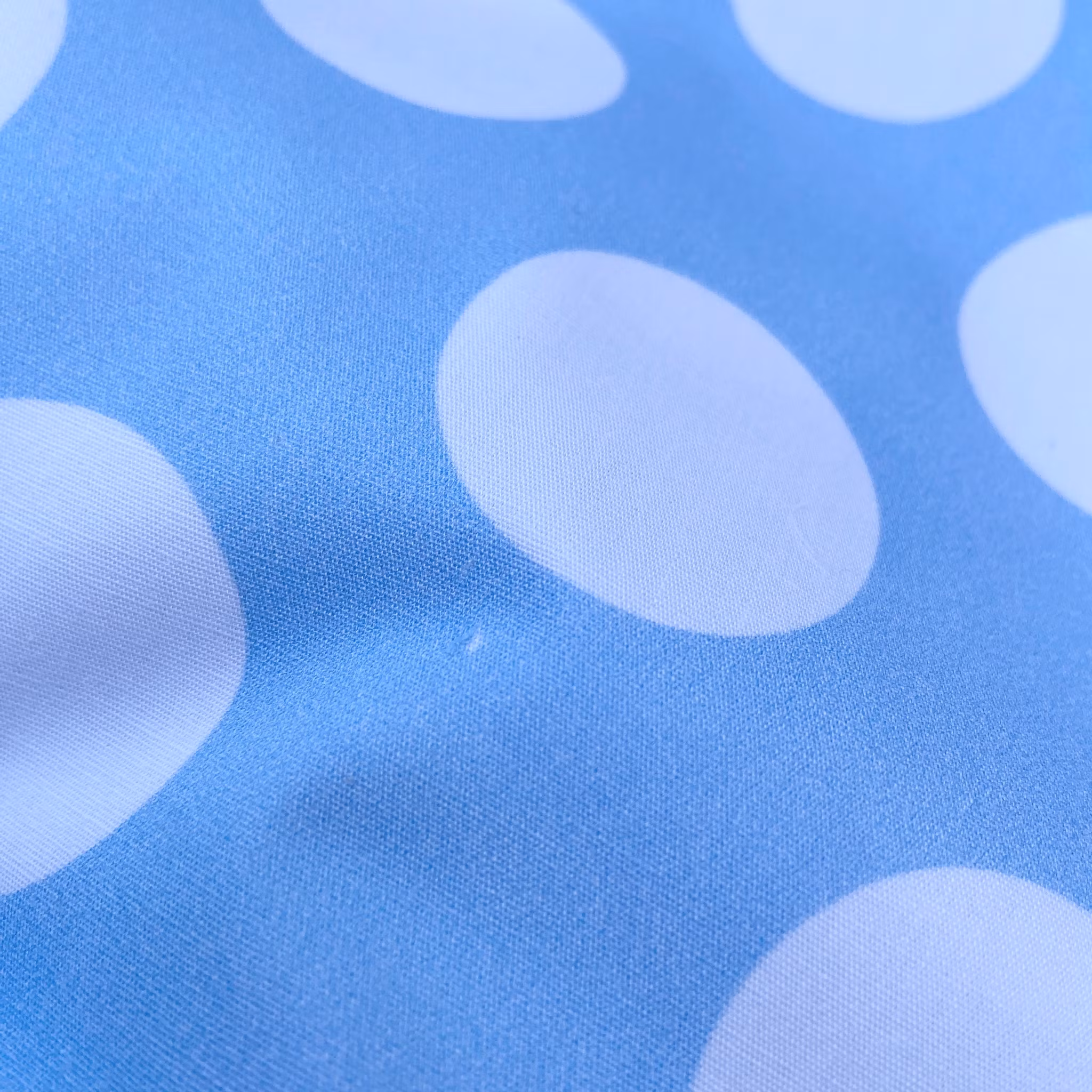 Färg: Ljusblått med vita regelbundna, stora prickar.